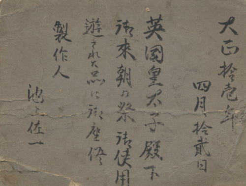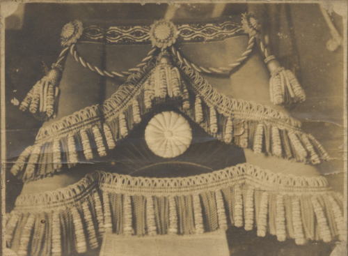 大正11年(1922年)、イギリスのエドワード・アルバート皇太子殿下が来日した際に、父の佐一が製作した儀礼馬車の御者台をご使用になられたのです。この写真は、そのときの記録と写真です 。当時、佐一は馬車職人としても知られており、当品も錦糸や銀糸の刺繍にて丁寧に作り上げた逸品です。この一週間後にアルバート皇太子と昭和天皇が親善ゴルフをしたことはちょっと有名な話です。