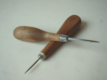 そこで、針が革に刺さりやすいように、刃先が菱形になっているこの菱錐(ひしきり)を使います。それでも、結構な力のいる仕事なんですよ。
