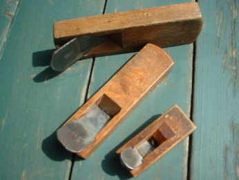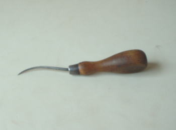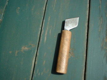 型取りした革の形を整えるために、鉋(かんな)で 削ったりします。微妙にカーブのあるフチに威力を発揮するのが、この豆かんなです。普通の鉋と違い、台の部分が丸くなっていて、名前のとおり、とってもかわいい鉋です。革のふちの部分を削るのを、こばを取ると言います。