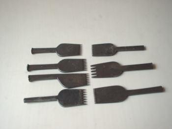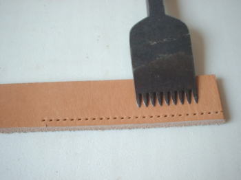 革に縫い目のしるしを付けるのに、この目うちを使います。縫い目によって、3センチ幅で8目〜4目まで、10種類くらいあります。 目打ちを革にあて打ち木で、丁寧に印を打ちつけていきます。