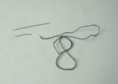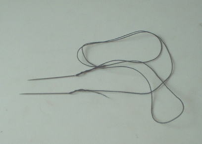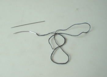 鞍褥の床に革を縫い付ける際、この少し太く曲がったすくい針を使います。この曲がりが、とても革を縫いやすくしています。